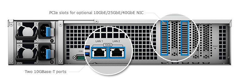 FS3017 內(nèi)建雙 10GBase-T 網(wǎng)絡(luò)端口。當(dāng)你需要更多的帶寬時(shí),可透過(guò)兩個(gè) PCIe 插槽新增額外的網(wǎng)絡(luò)控制器,也可選擇 10GbE、25GbE 與 40GbE 網(wǎng)絡(luò)適配器以發(fā)揮 FS3017 的效能。此外,通過(guò)額外購(gòu)買 FS3017 支持的網(wǎng)絡(luò)適配器,iSCSI over RDMA 技術(shù)更可進(jìn)一步強(qiáng)化約 80% 的 iSCSI 效能。