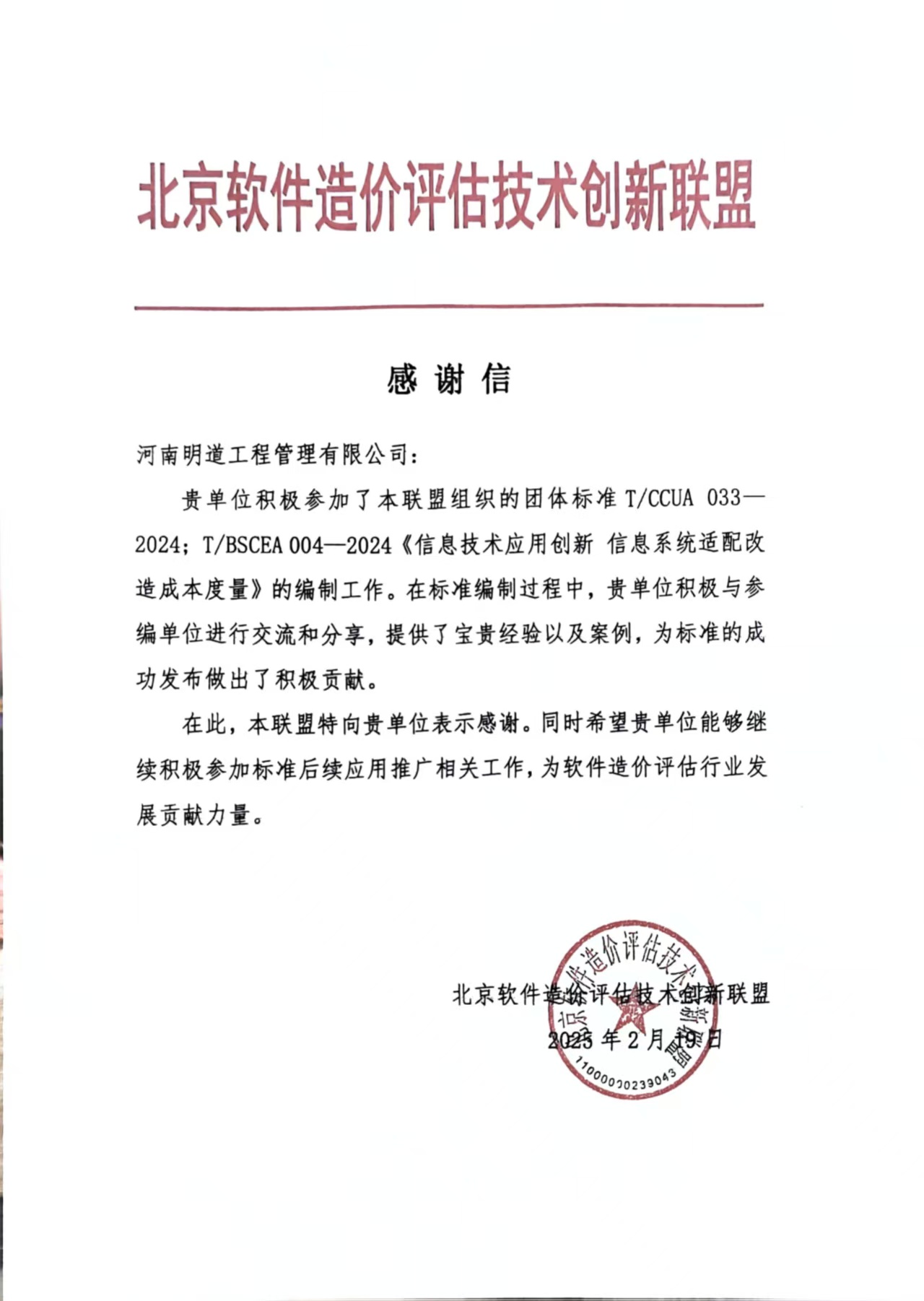 2025年2月19日,河南明道工程管理有限公司收到北京軟件造價評估技術(shù)創(chuàng)新聯(lián)盟發(fā)來的感謝信,聯(lián)盟對于明道在《信息技術(shù)應(yīng)用創(chuàng)新 信息系統(tǒng)適配改造成本度量》(T/CCUA 033-2024)的編制工作中做出的積極貢獻表示了充分的肯定和由衷的感謝。